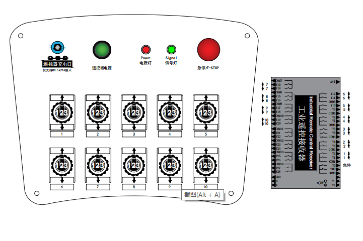 10個(gè)三位自復(fù)位撥桿(可更換為三位自鎖保持撥桿),每個(gè)撥桿均為前中后3個(gè)位置,前推或后推,松開后則自動(dòng)回到中間零位,每個(gè)撥桿均可單獨(dú)控制一個(gè)電機(jī)正反轉(zhuǎn)或類似上升下降或伸縮縮回此類正反向動(dòng)作10組,每個(gè)撥桿對(duì)應(yīng)接收器端2路開關(guān)量,10個(gè)合計(jì)對(duì)應(yīng)接收器端20路開關(guān)量信號(hào)輸出。