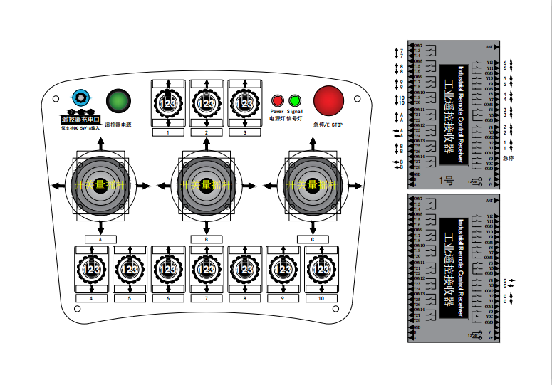 布局配置:3個四方向開關量自復位搖桿,12個三位自復位撥桿, 2個指示燈,充電孔,及啟動和急停蘑菇頭;